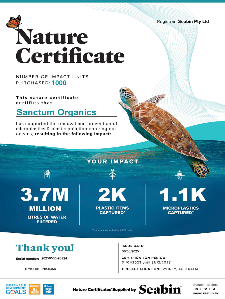 Unlike some products that claim to be organic with as little as 10% organic ingredients mixed with synthetics, Sanctum is committed to authenticity. We undergo rigorous certification through ACO, accredited by COSMOS, setting a high international standard that we exceed. This includes auditing our formulas, manufacturing processes, and facilities, ensuring you receive a genuinely Certified Organic product every time.